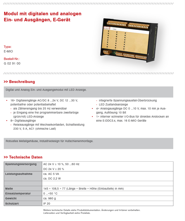 16× digital inputs AC/DC 8…24 V, DC 12…30 V, floating or floating – can be used as a counter input up to 25 Hz – each input has a freely programmable two-color (green/red) LED display • 8× digital outputs – relay outputs with changeover contacts , switching capacity 230 V, 5 A, AC1 (resistive load) -integrated voltage failure bridging -LED status display • 4× analog outputs DC 0 …10 V, max. 10 mA per output, resolution 10 bit • 1× internal fast I/O- Bus for direct docking to an E-DDC3.x, max. 16 E-MIO devices